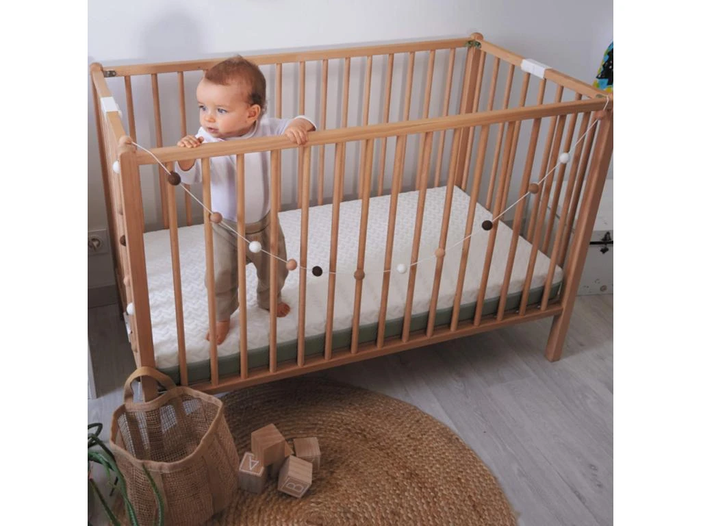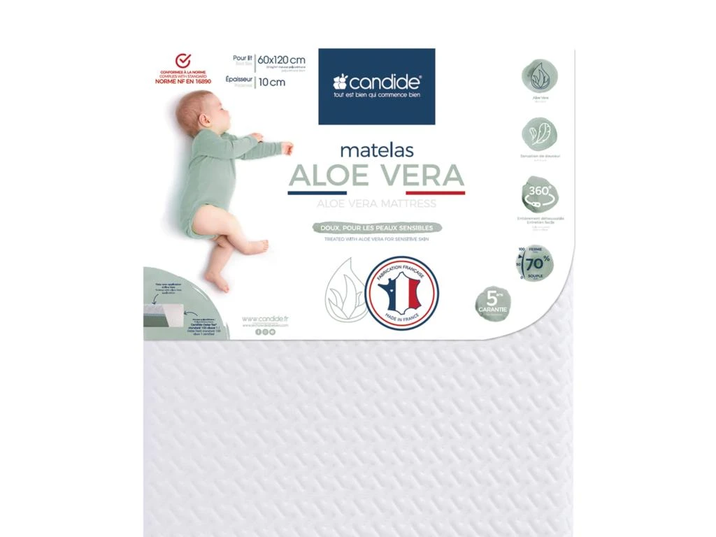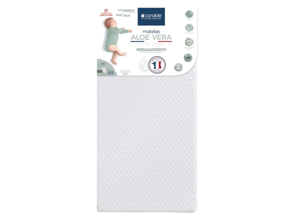 Matelas bébé ALOE VERA, déhoussable. Epaisseur de 10 cm. Application d’Aloe Vera sur l’intégralité du coutil. Lavable en machine à 30°C.