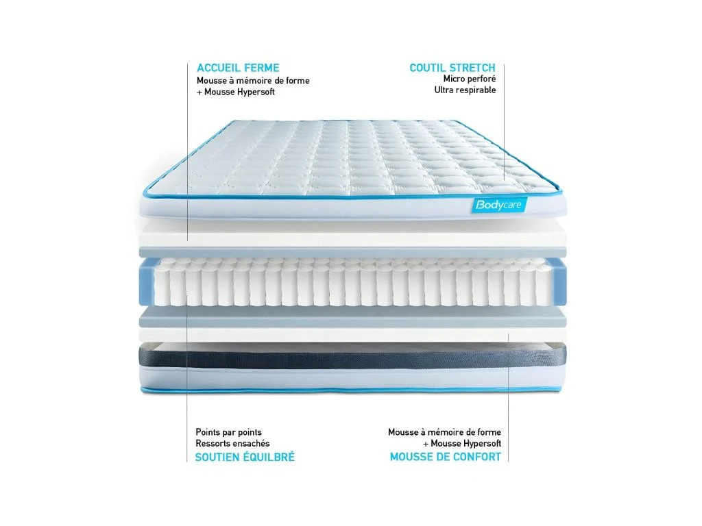 Le matelas BodyFlex est l’alliance parfaite de la mousse à mémoire de fome et des ressorts ensachés.Ce matelas dispose d’une maxi épaisseur de 26cm.