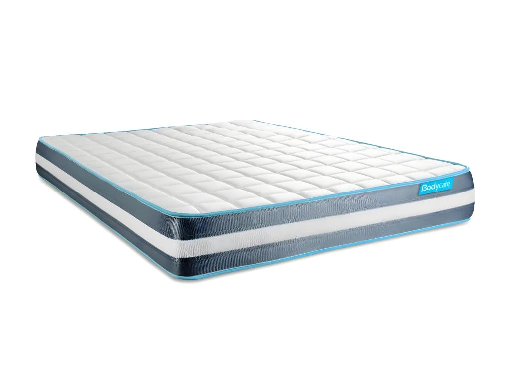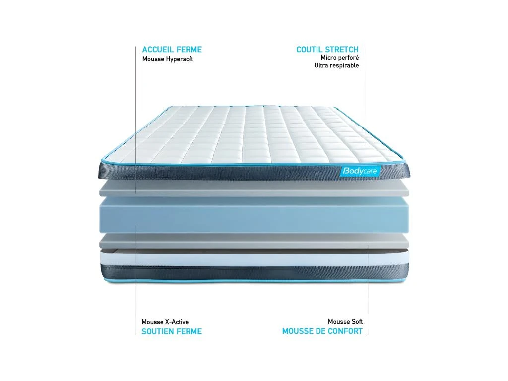 Le matelas BODYFORM de la marque BODYCARE bénéficie des dernières innovations en matière de mousse à mémoire de forme pour vous offrir le confort et le soutien unique dont votre corps à besoin. D’une tenue ferme, son accueil enveloppant s’adapte à vos courbes et allège les points de pression en épousant les spécificités morphologiques de votre corps. Sa plate‐Bande 3D micro aérée, associée à son coutil micro perforé ultra respirable vous garantissent une aération optimisée du matelas.