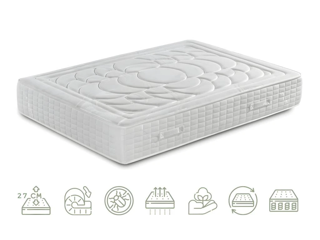 - Matelas de 27 cm de haut avec 6 cm de mousse à mémoire de 55 kg/m3 (3 cm de chaque côté).