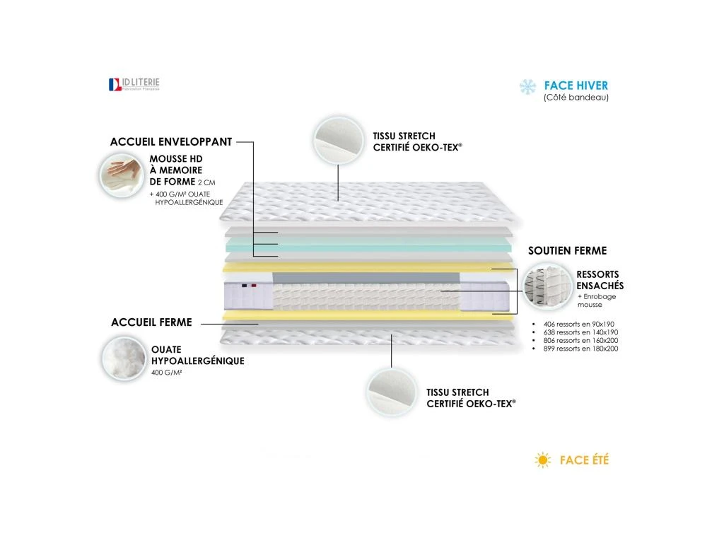 Ame : 392 ressorts ensachés en 90×190 / 616 ressorts ensachés en 140×190 / 780 ressorts ensachés en 160×200 / 870 ressorts ensachés en 180×200