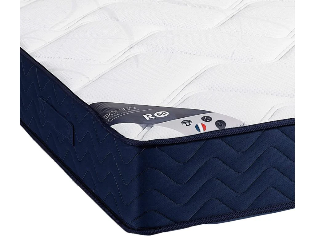 Matelas SOMEO à ressorts ensachés + couchage en mousse de confort. Les ressorts ensachés garantissent l’indépendance de couchage, tandis que la mousse de confort apport le confort douillet au matelas.