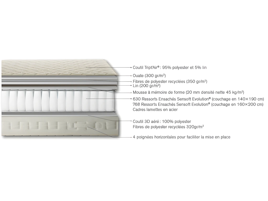 Une ventilation accrue rendue possible grâce à sa bande périmetrale assurant une auto-ventilation naturelle pour un couchage sain toute l’année Limitation des micro-reveils : équipé de ressorts ensachés SenSoft Oringine offrant une parfaite indépendance de couchage et évitant les réveils lorsque votre partenaire bouge.