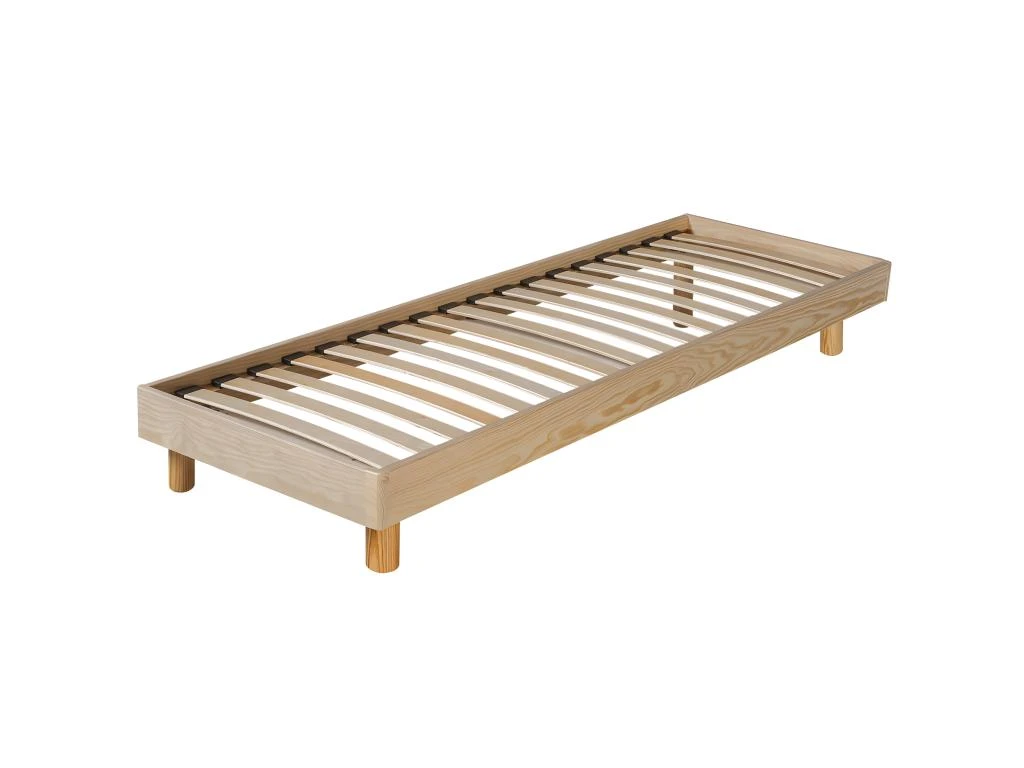 Structure en sapin massif naturel. Sections longs pans et courts pans : 120 x 22 mm. Livré avec un jeu de 4 pieds Diam 60 mm assortis + 1 pied central. Lattes multiplis bois et embouts polypropylène.