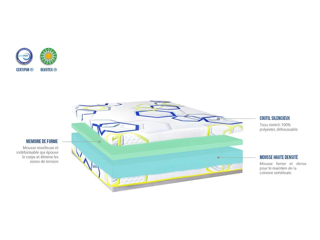 - Âme intérieure du matelas (CertiPUR) : 18 cm de mousse Haute Densité de 28 kg/m³ + 3 cm de mousse viscoélastique à mémoire de forme Optima+ de 50 kg/m³