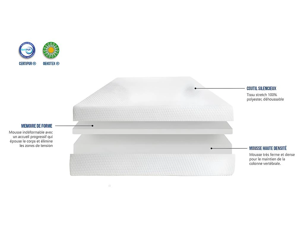 - Âme intérieure du matelas (certifiée CertiPUR) : 17,5 cm de mousse Haute Densité de 33 kg/m³ + 6,5 cm de mousse viscoélastique à mémoire de forme de 60 kg/m³