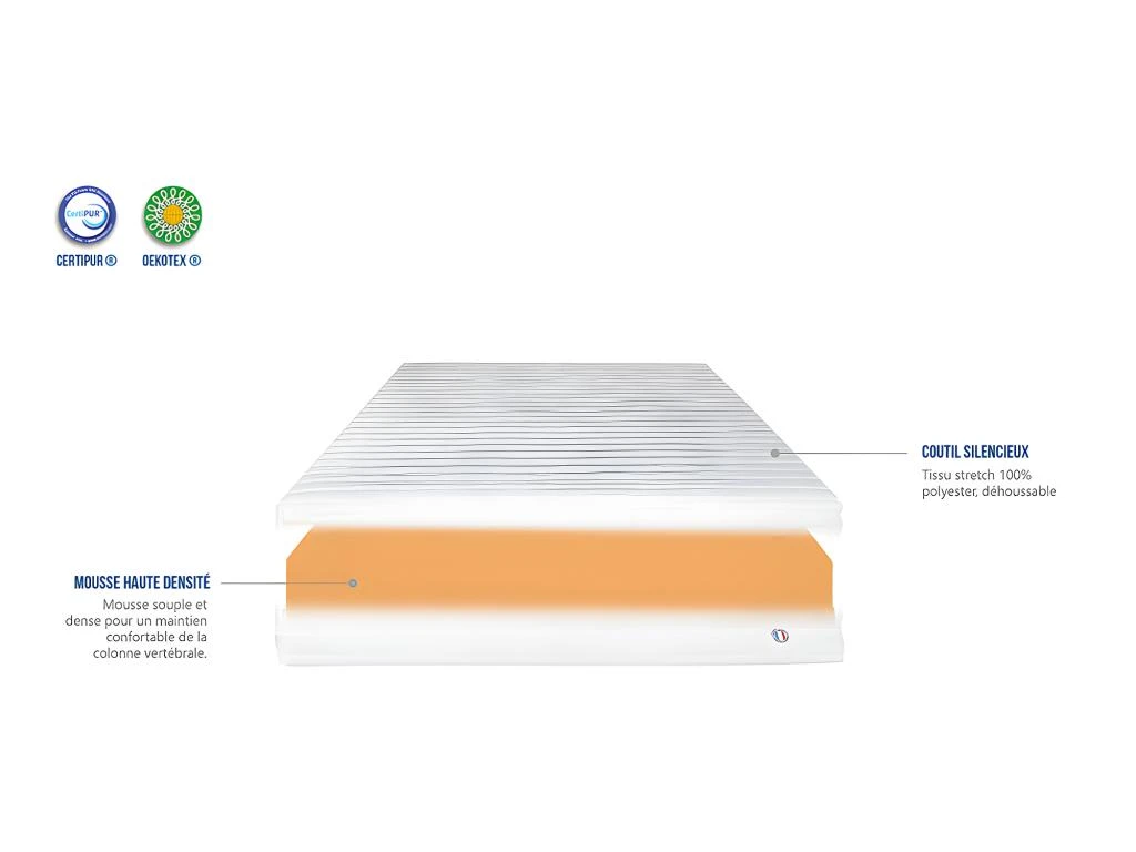 - Âme intérieure du matelas (certifiée CertiPUR) : 12 cm de mousse polyéther Haute Densité de 25 kg/m³