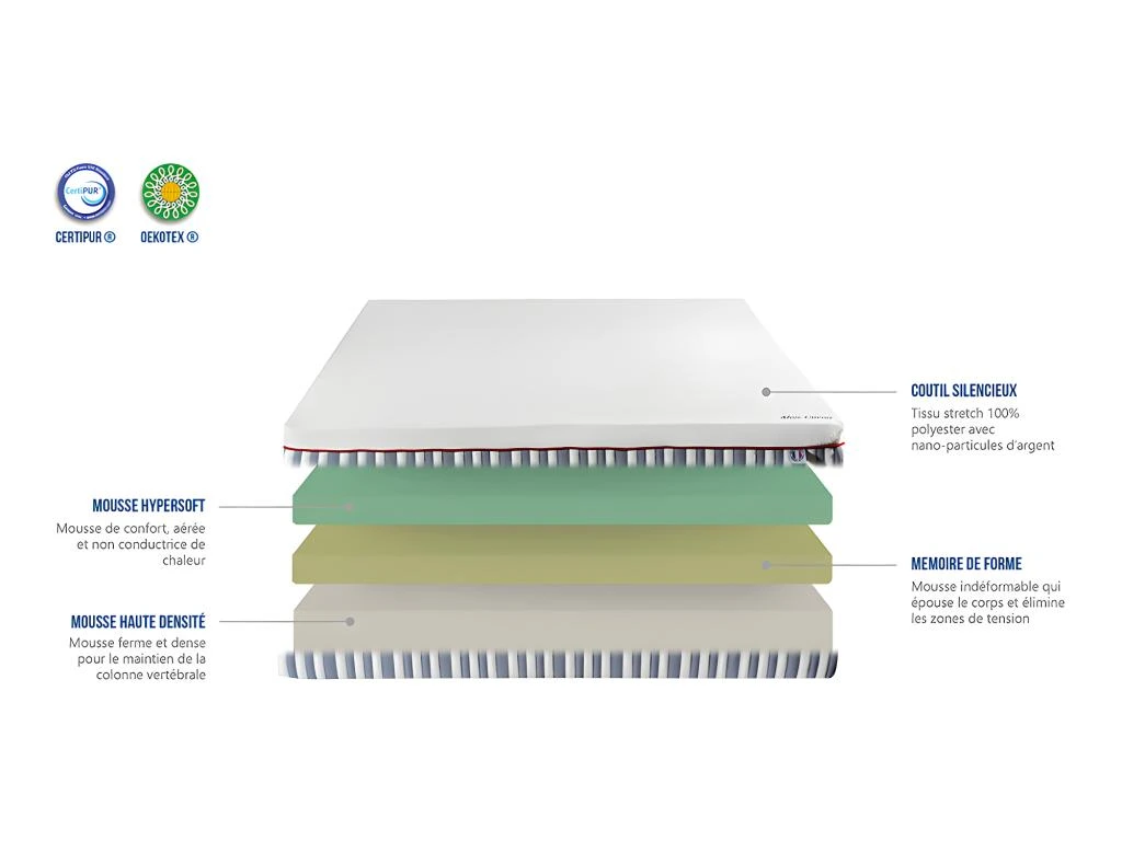- Technologie : Mémoire de forme et Mousse hypersoft