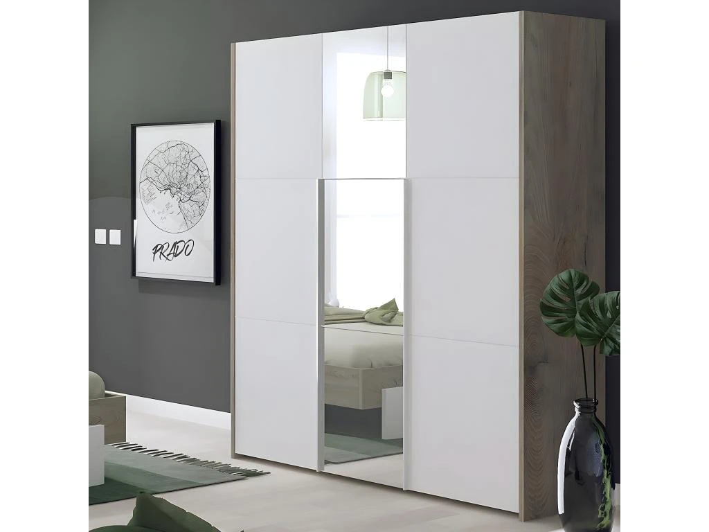 MADE IN FRANCE : Armoire 3 Portes Effet Bois Clair avec Miroir de la gamme Nino Light.