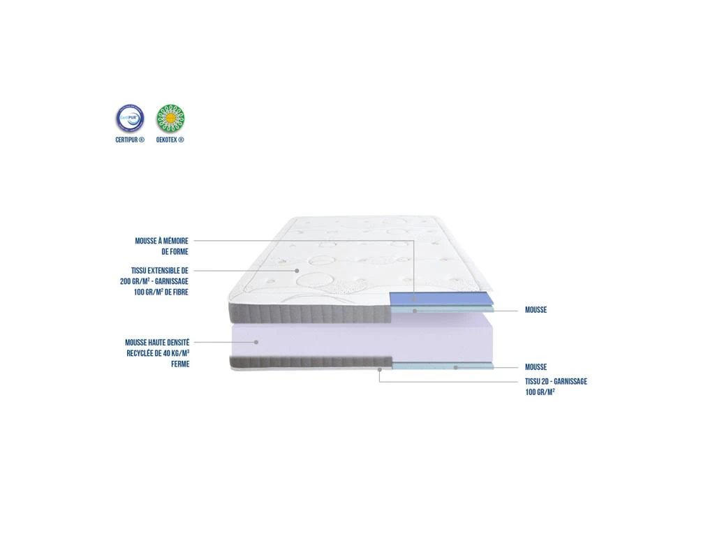 - Âme intérieure du matelas : 12,5 cm de mousse Haute Densité recyclée de 40 kg/m³ Ferme.