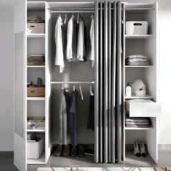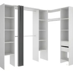 Dressing D’angle Avec Rideau Et 1 Porte – Avec Miroir – L231 Cm – Blanc Et Gris – BERTRAND