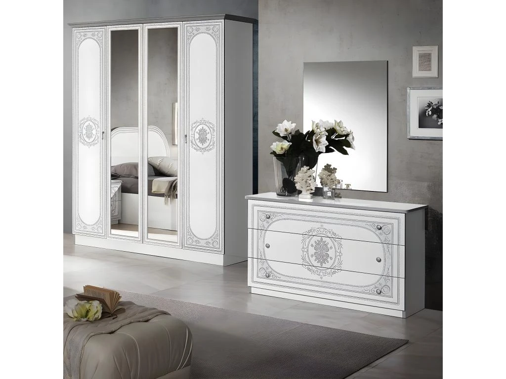 Structure en panneaux de particules Ep. 18mm, revêtement en mélaminé blanc brillant. Champs et Corniche en mélaminé gris. 2 portes en panneaux de particules Ep. 18mm, revêtement en mélaminé blanc, champs en mélaminé gris, motif arabesque sérigraphié argenté et 2 portes miroirs. Dos en MDF. Poignées métalliques. Côté droit : 3 tablettes de rangement. Côté gauche : 1 tablette supérieure + 1 penderie.