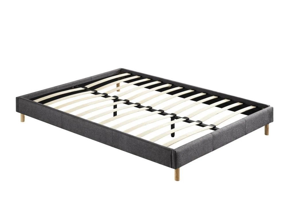 La structure du lit en bois est recouverte d’un revêtement en tissus, de coloris gris