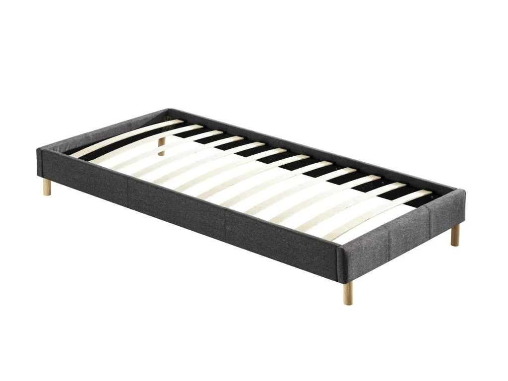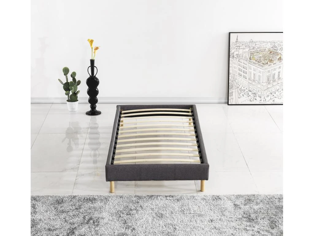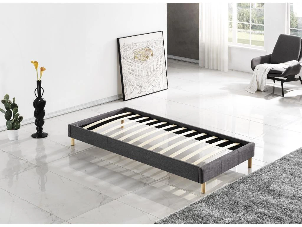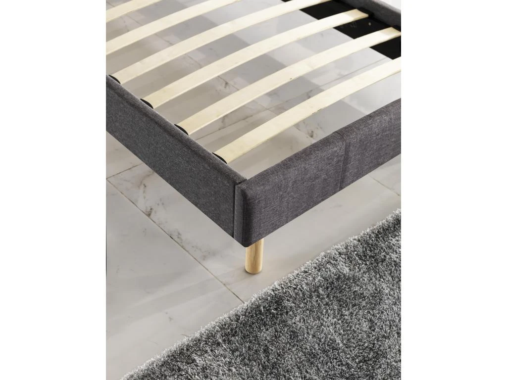 La structure du lit en bois est recouverte d’un revêtement en tissus, de coloris gris