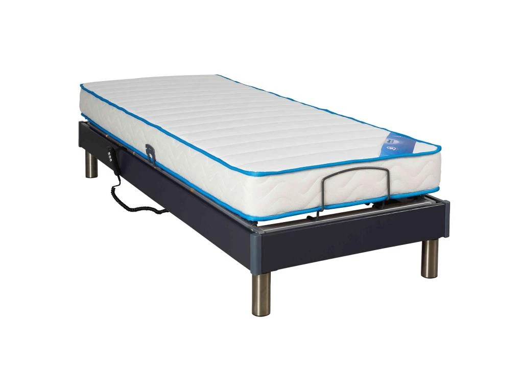 Sommier électrique de relaxation doté d’une suspension mixte à plots et lattes. Les plots apportent un confort de précision au dos, tandis que les lattes garantissent le soutien nécessaire à la partie bassin, cuisses et jambes. Il est équipé d’une télécommande filaire, de 3 arrêts matelas, et d’une pile de remise à plat en cas de coupure de courant. Moteur allemand.