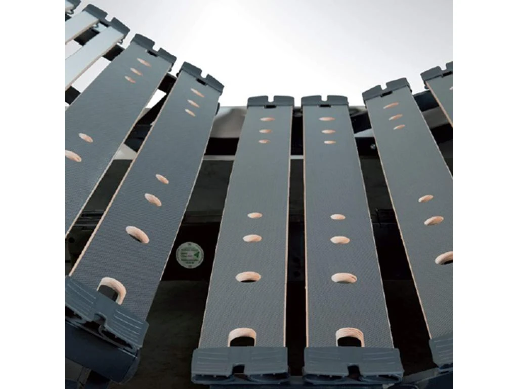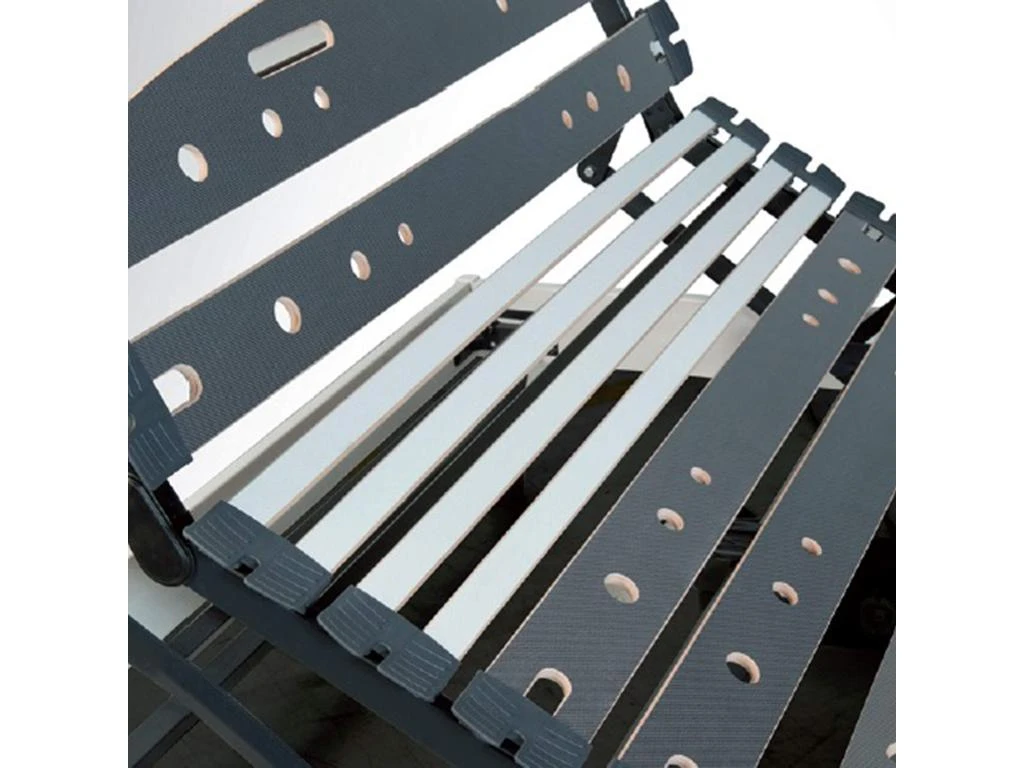 – Suspension : 11 lattes larges et épaisses (12,5 mm) en bois multi-plis perforées finition « graphite »