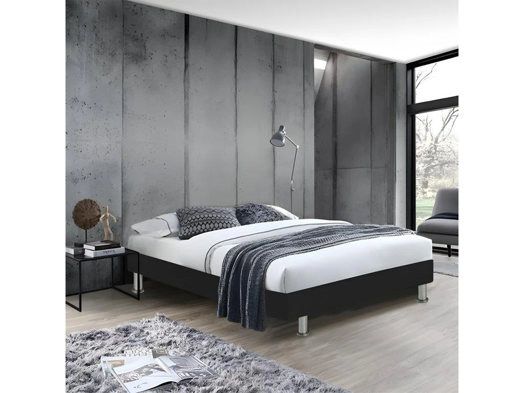 Ajoutez un matelas à ce sommier tapissier, pour des nuits confortablement douces et paisibles. On aime sa matière en simili noir, qui inspire un style moderne chic, et son piètement en métal qui apporte quant à lui, un petit côté industriel à l’ensemble. Avec une structure et des lattes composées en bois de pin massif, ce sommier vous garantira une tenue ferme et sans faille pour vous permettre un sommeil réparateur dans le plus grand des conforts ! Existe également en d’autres tailles.