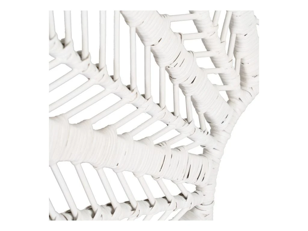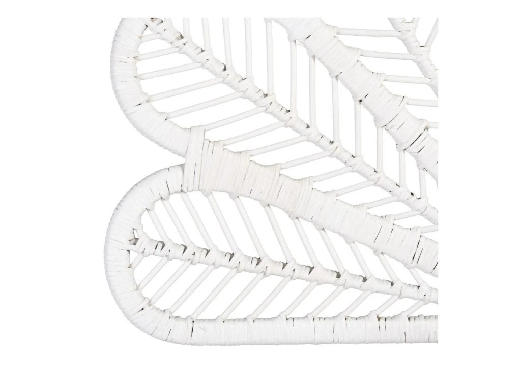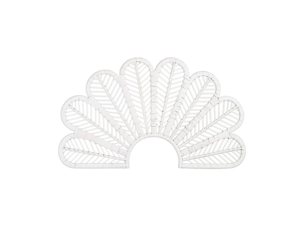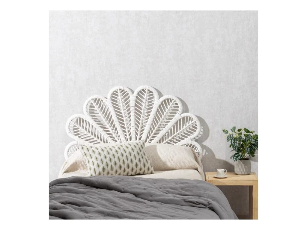 Tête de lit à suspendre réalisée en rotin teinté Blanc pour la mise en scène d’une déco faisant la part belle aux matériaux authentiques.