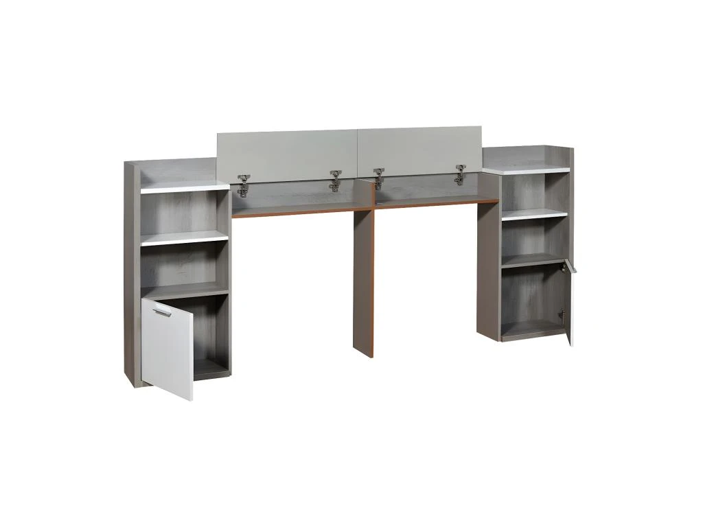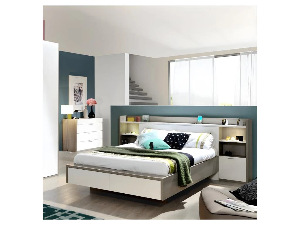 Très pratique tête de lit aménagée associant des surfaces de pose et des rangements derrière 2 portes.